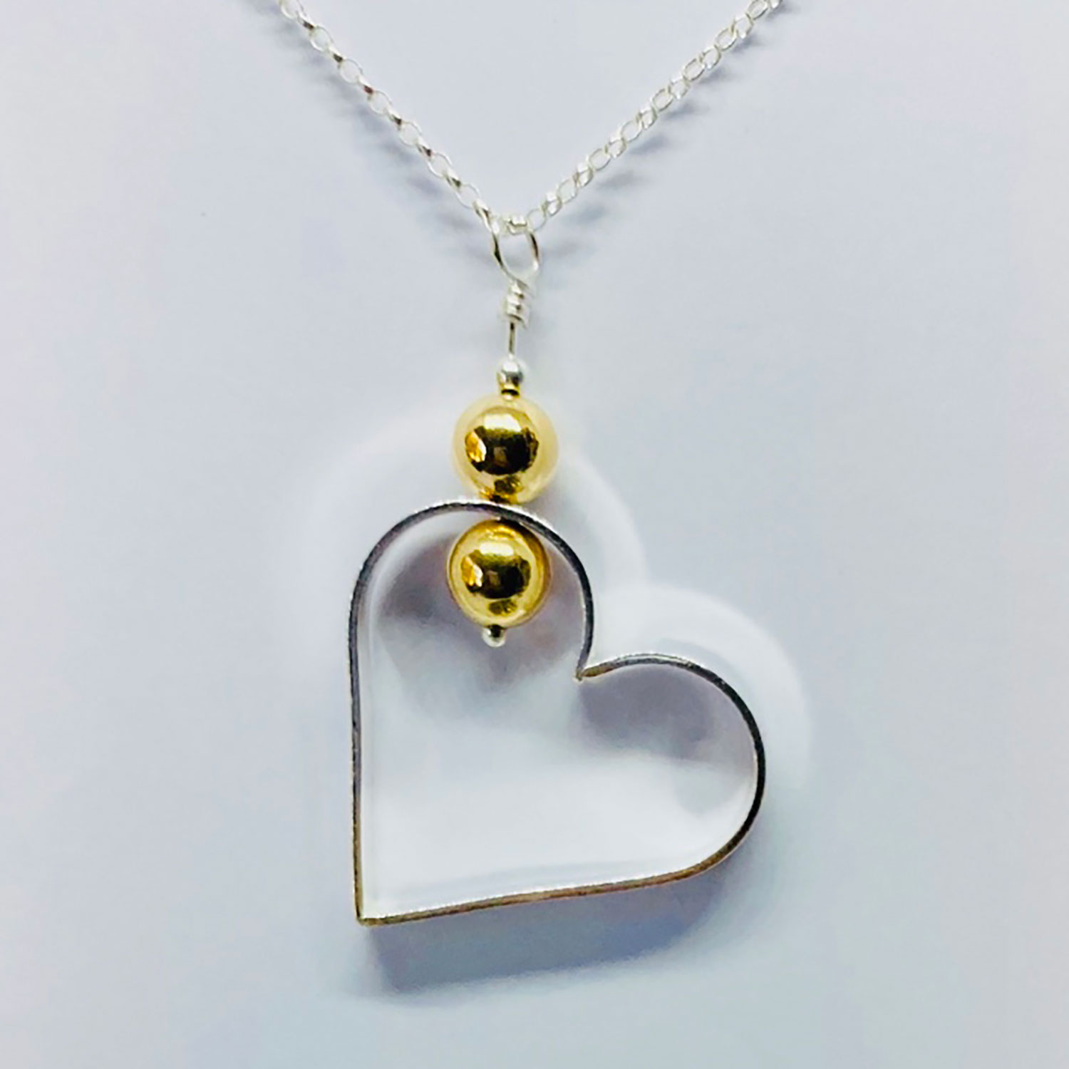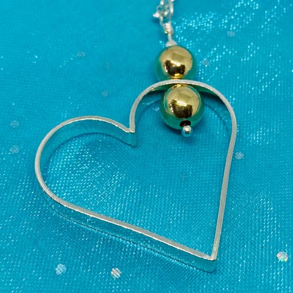 A smooth flat 3.5cm open heart with two 8mm gold filled beads on an 18’’ chain
