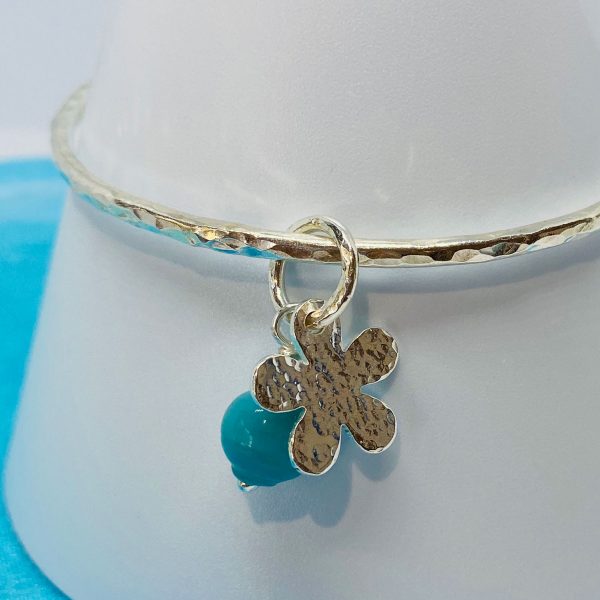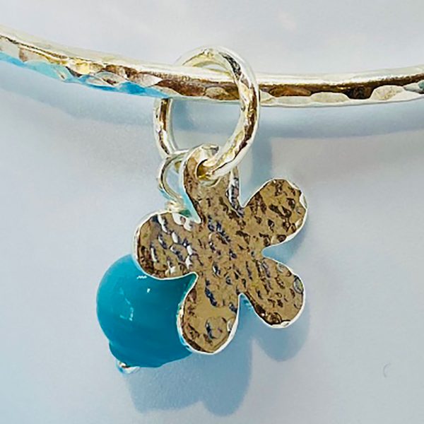 Silver hammered bangle with flower & coloured bead