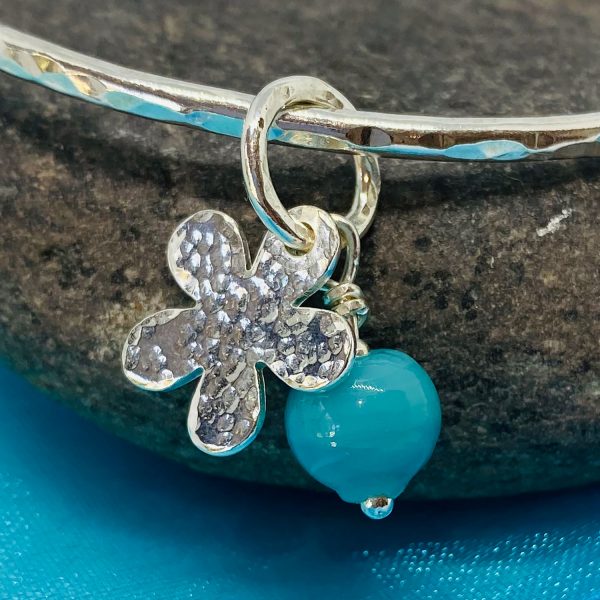 A silver 2.5mm hammered bangle with a silver flower and coloured bead charm