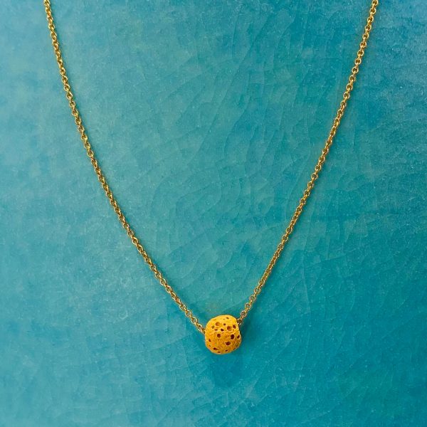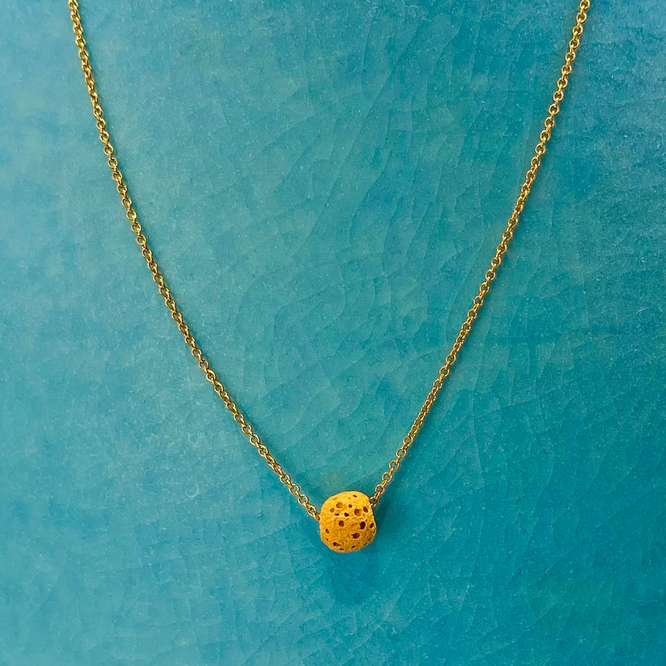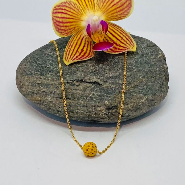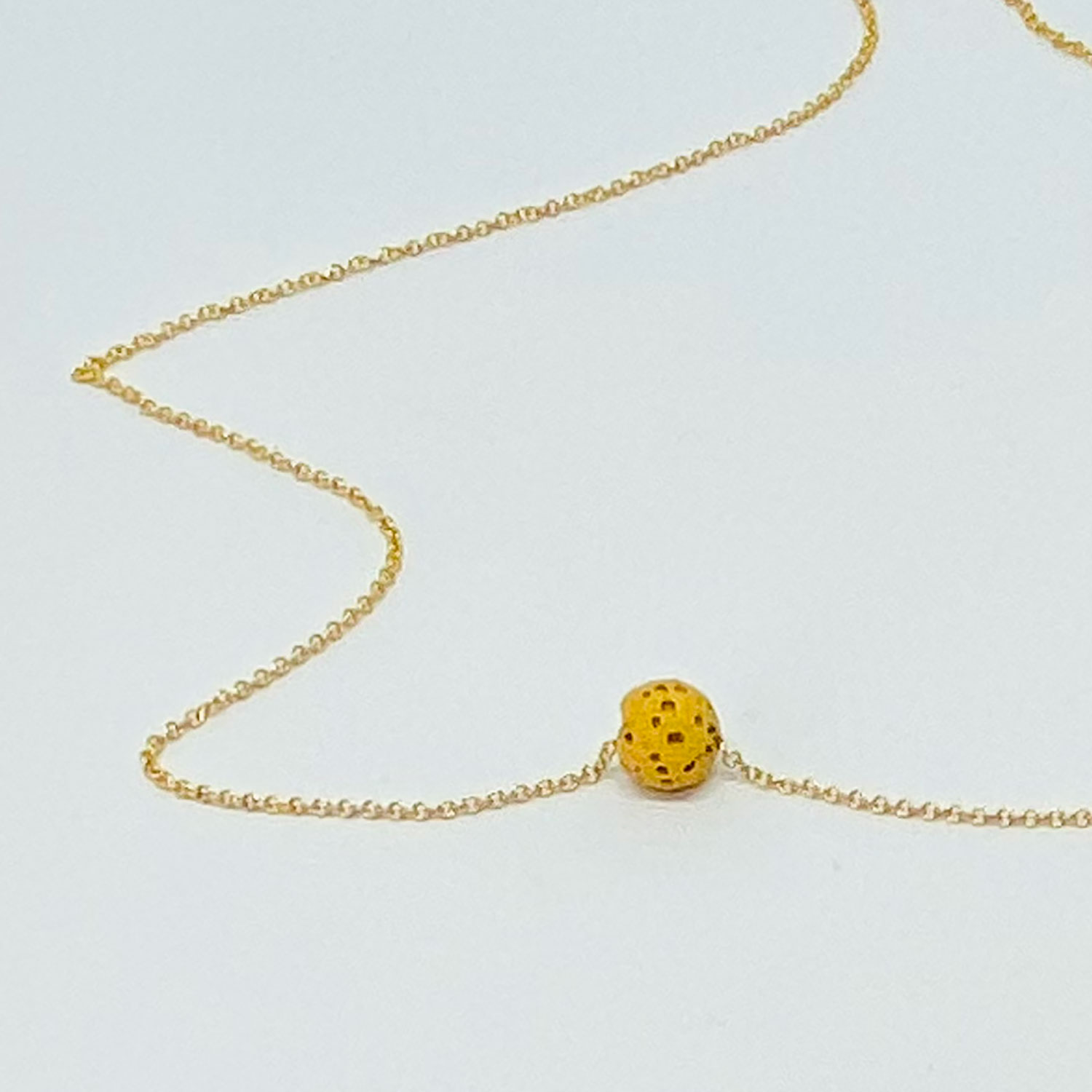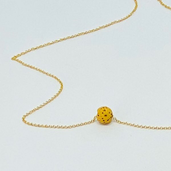 A mustard coloured lava bead on a 16 inch gold filled chain