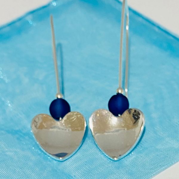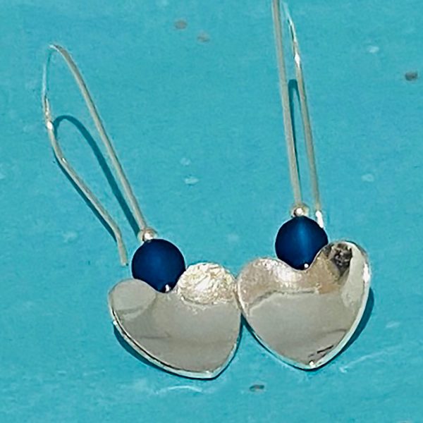 A Smooth domed heart with a dark blue bead on silver wires (various colours available)