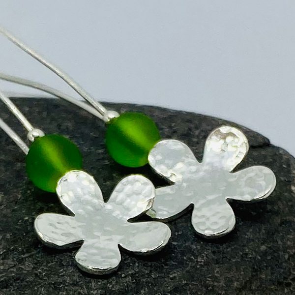 Silver hammered flowers with a green bead