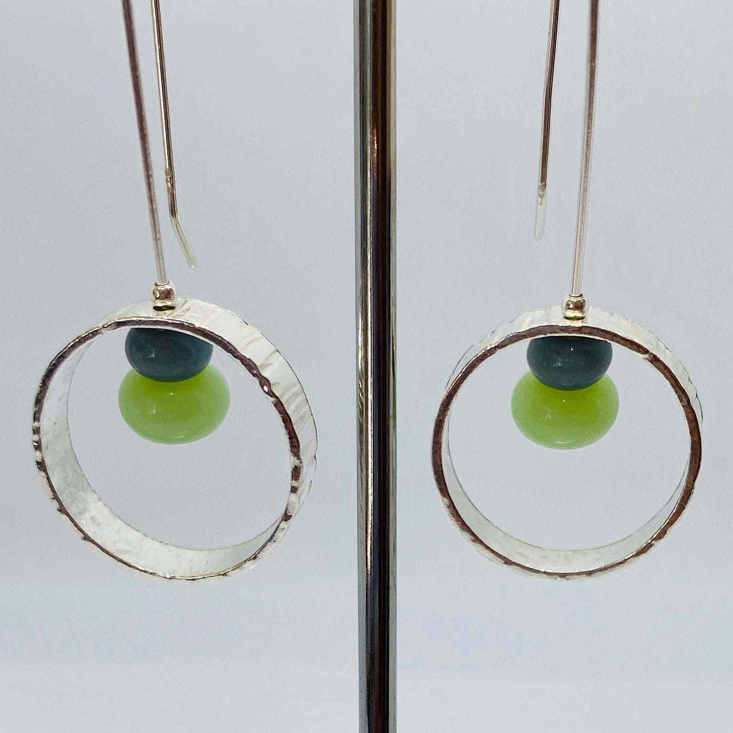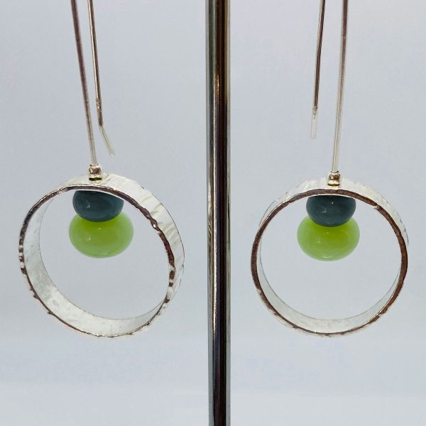 Line effect flat silver hoops with 2 internal coloured beads on silver wires (various colours available)