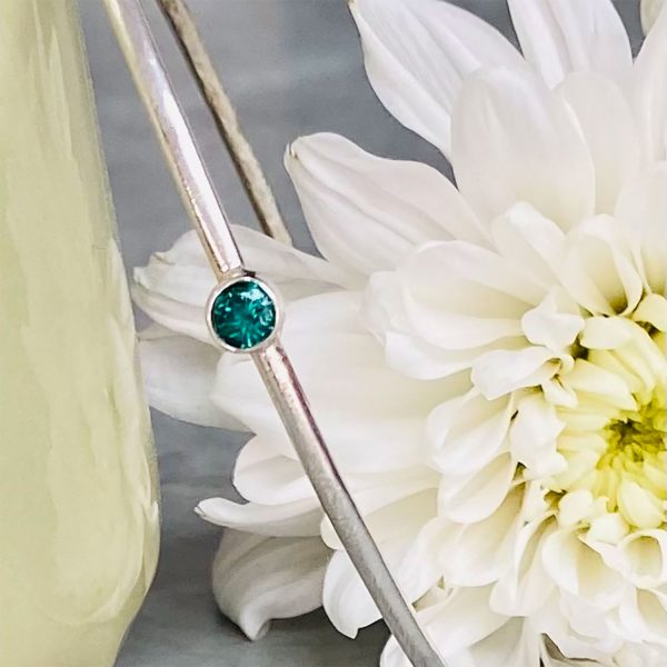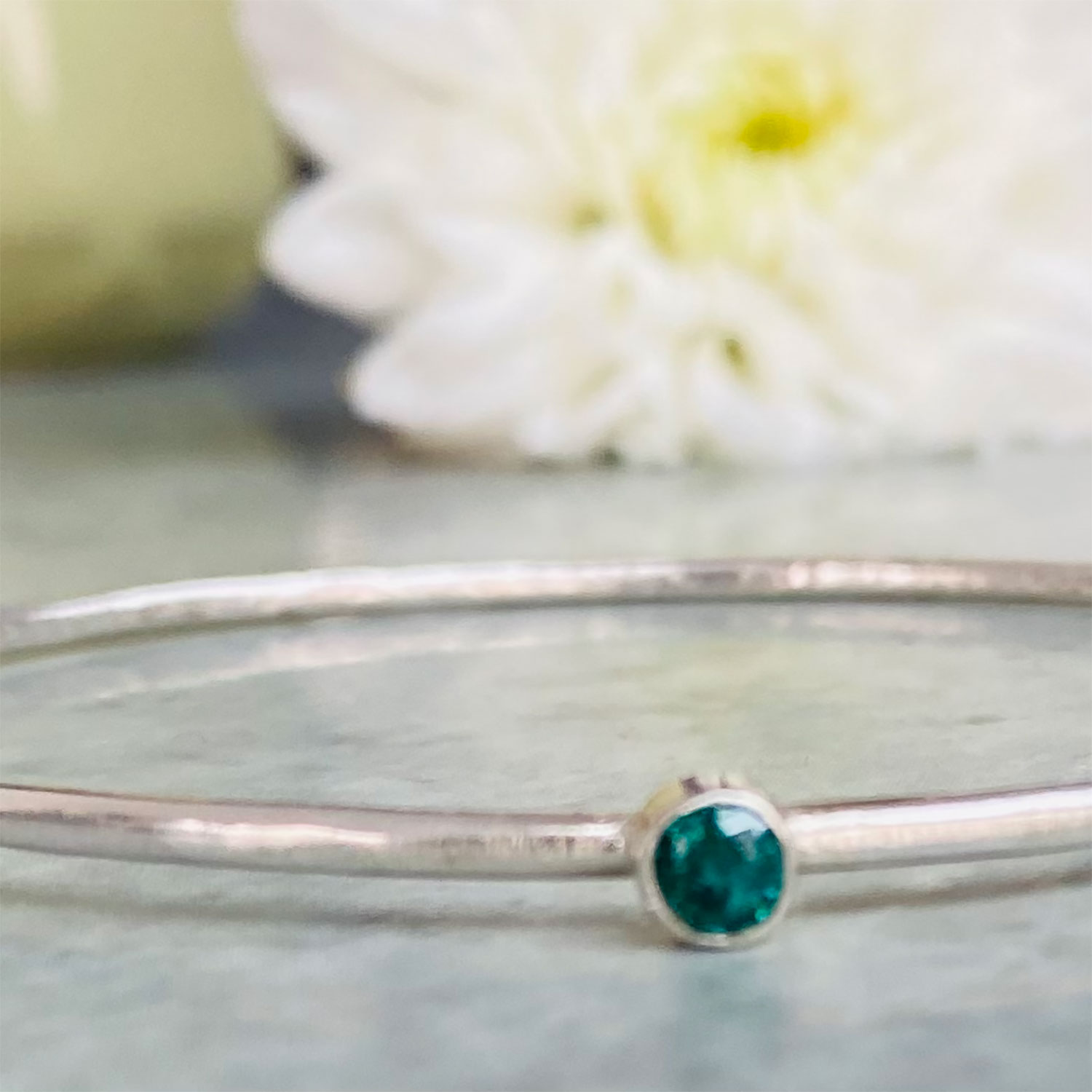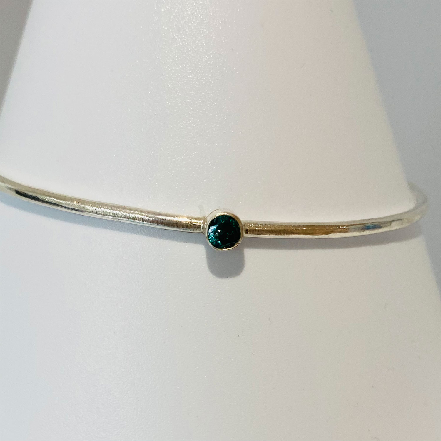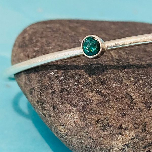 Silver 2mm smooth bangle with a 4mm green cubic zerconia