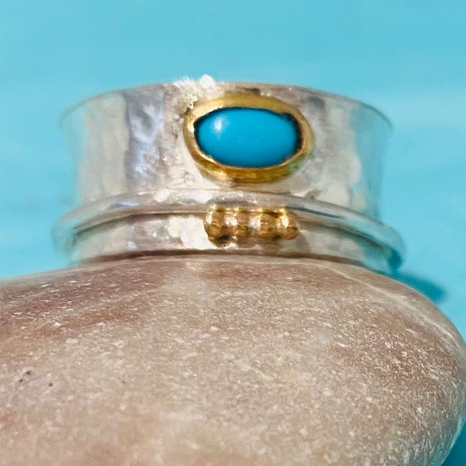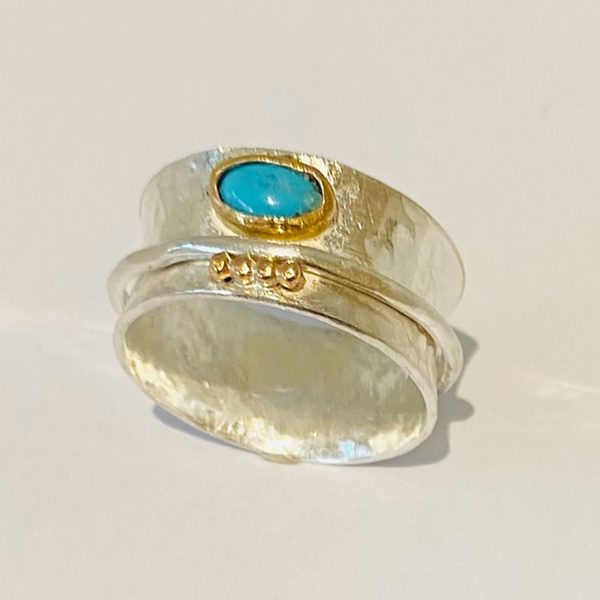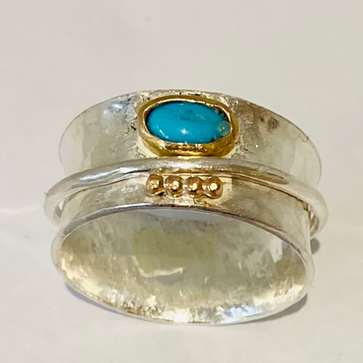 Silver 10mm band with a silver spinner an oval turquoise set in gold filled with four tiny gold filled balls