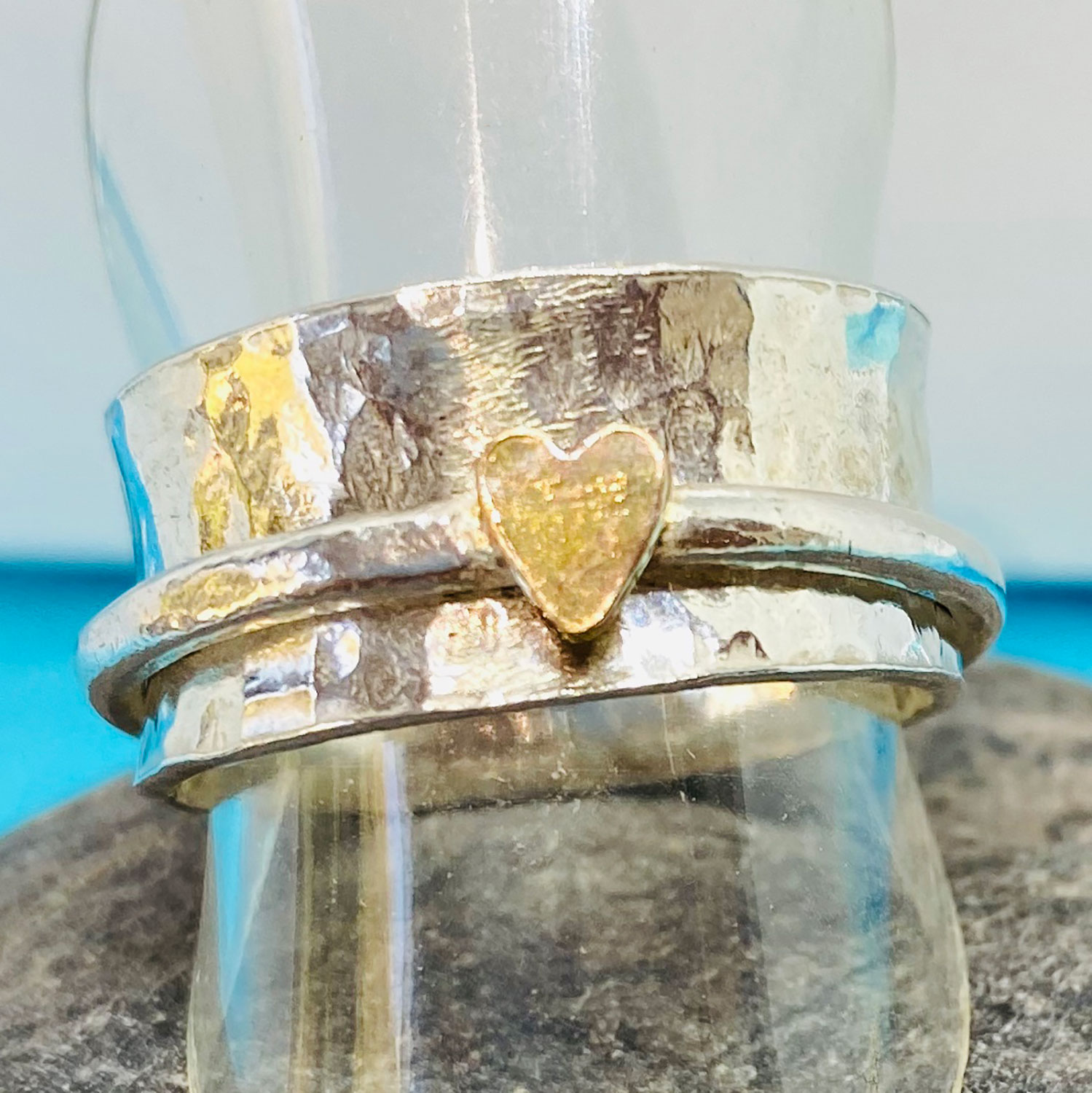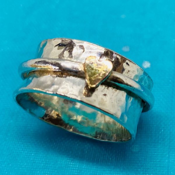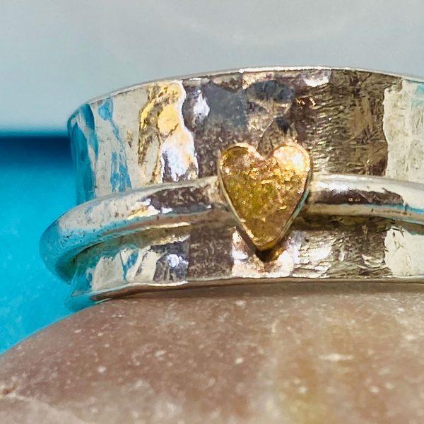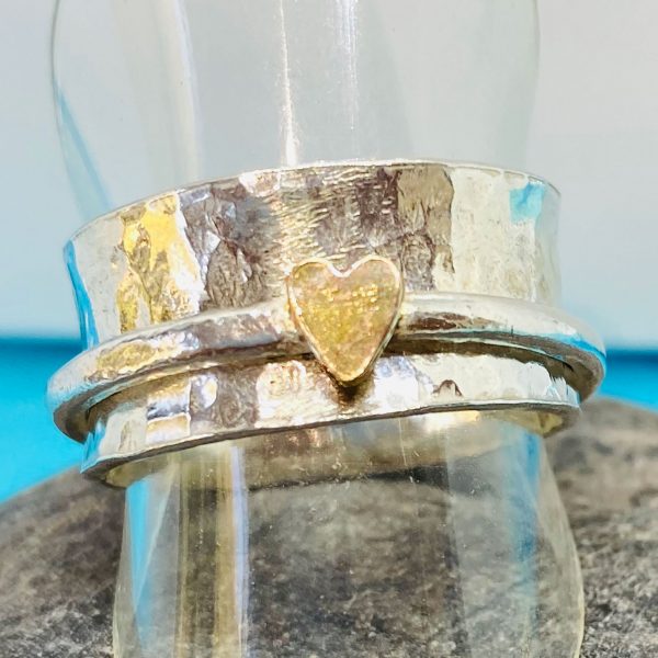 1cm wide hammered ring with a 1.5mm smooth spinner ring and tiny filled gold heart